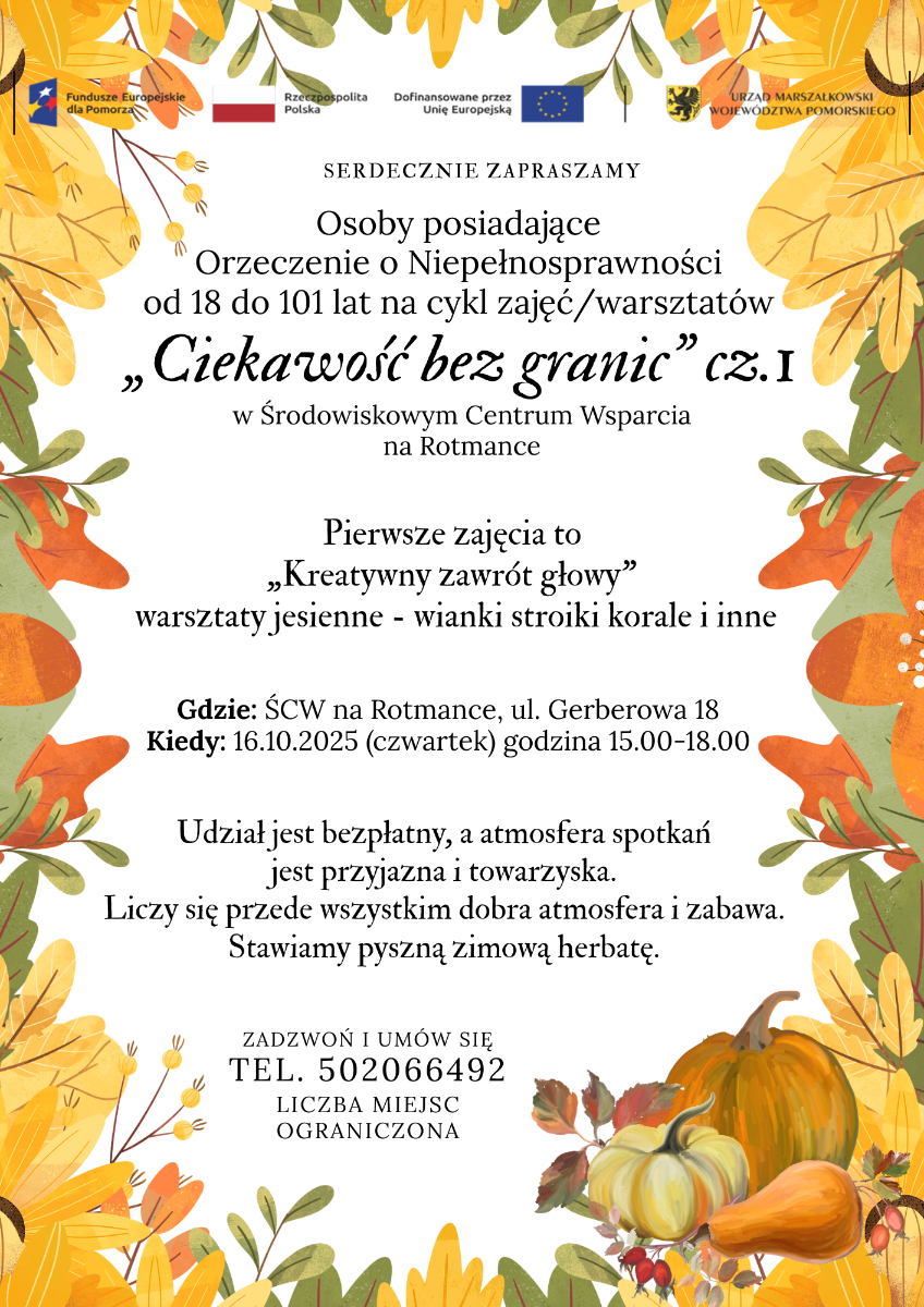 Osoby w wieku 18-101 lat posiadające orzeczenie o niepełnosprawności mogą wziąć udział w cyklu bezpłatnych warsztatów. Pierwsze zajęcia, „Kreatywny zawrót głowy”, obejmą jesienne warsztaty artystyczne, w tym tworzenie wianków, stroików i korali.