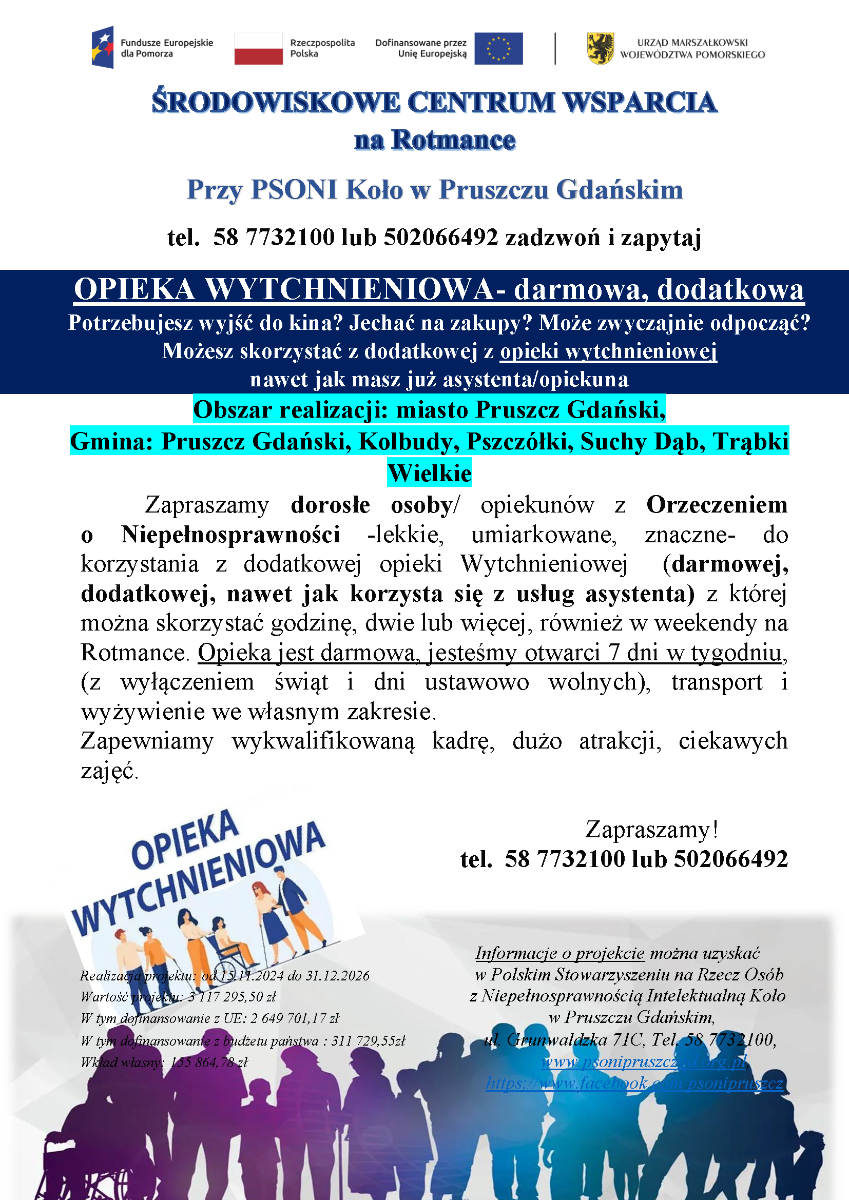 Opiekunowie dorosłych z orzeczeniem o niepełnosprawności mogą skorzystać z darmowej, dodatkowej opieki wytchnieniowej. Usługa ta jest dostępna przez 7 dni w tygodniu (z wyłączeniem świąt i dni ustawowo wolnych), a w jej ramach można skorzystać z usługi asystenta, transportu i wyżywienia. PSONI gwarantuje wykwalifikowaną kadrę, dużo atrakcji i ciekawe zajęcia.