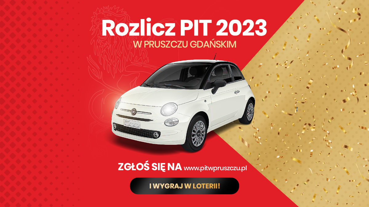 Do 7 maja 2024 r. trwa miejska akcja "Rozlicz PIT w Pruszcz Gdańskim"! Rozliczając podatek PIT jako mieszkaniec Pruszcza Gdańskiego, możesz wygrać hybrydowe auto lub 5 000 zł. Wystarczy, że w deklaracji PIT wskażesz jako miejsce zamieszkania adres z terenu naszego miasta i możesz zgłosić swój udział w akcji! Na stronie www.pitwpruszczu.pl znajdziesz krótki formularz rejestracyjny, po jego wypełnieniu otrzymasz swój osobisty numer loteryjny.