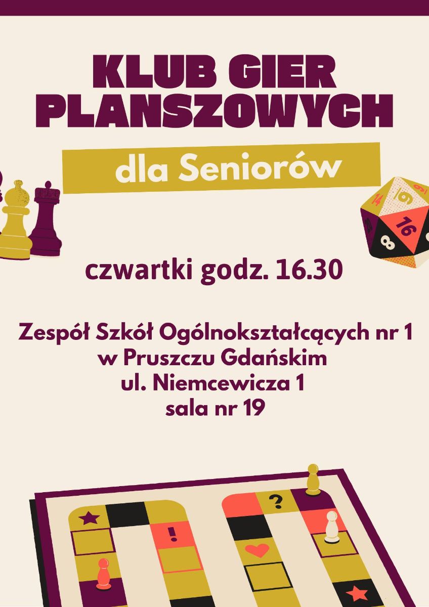 Spotkania w ramach Klubu Gier Planszowych odbywać się będą w każdy czwartek o godz. 16.30 w Zespole Szkół Ogólnokształcących Nr 1 w Pruszczu Gdańskim, ul. Niemcewicza 1, sala 19.