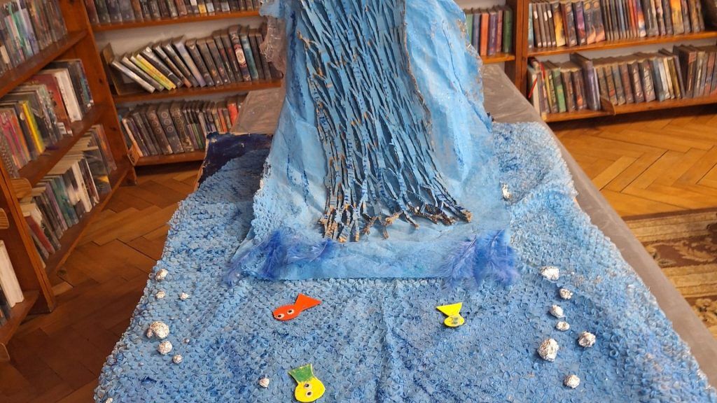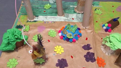 Praca zespołowa zaowocowała dużą, przestrzenną kompozycją przedstawiającą rzekę, roślinność i zwierzęta.