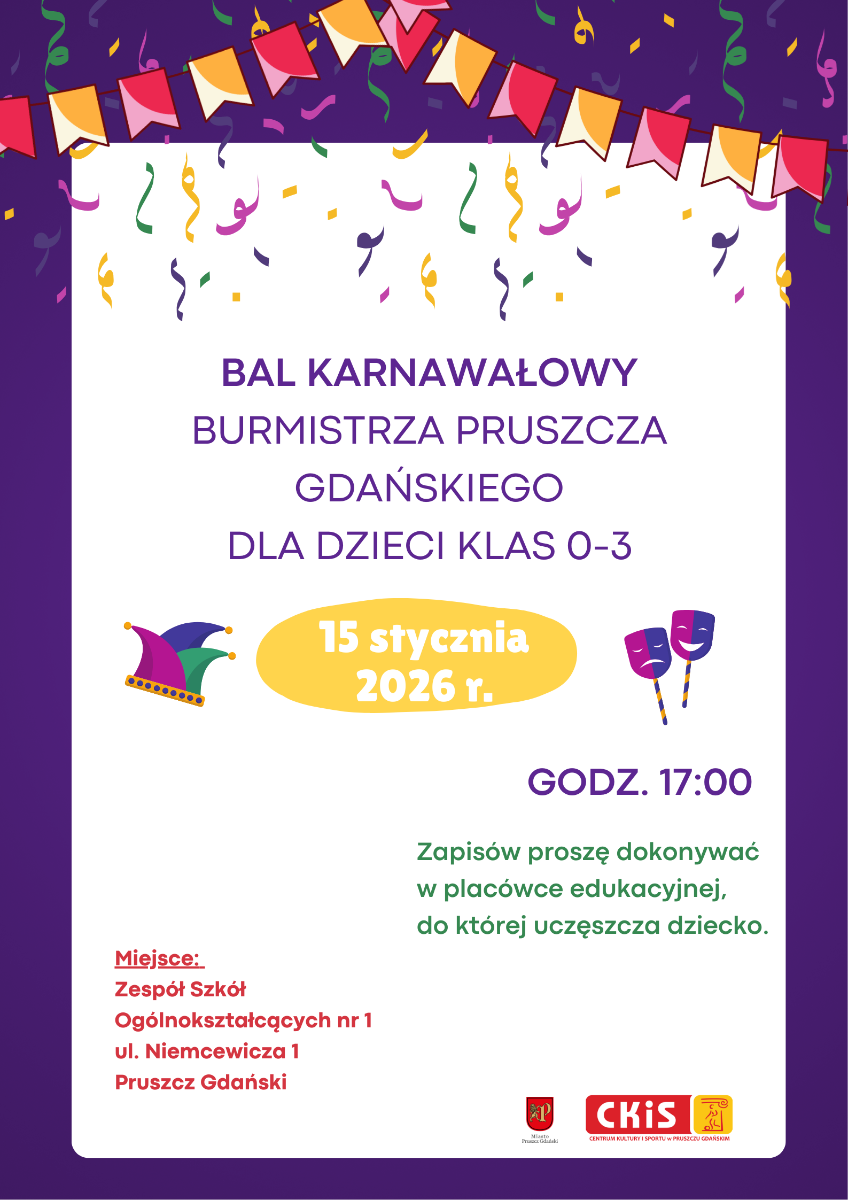 Burmistrz Pruszcza Gdańskiego zaprasza dzieci klas 0-3 na BAL KARNAWAŁOWY